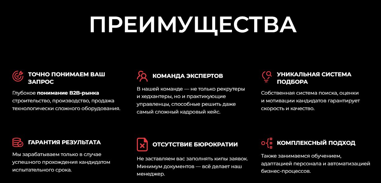 - Высокое качество подбора — использование современных методик и инструментов для точного соответствия кандидатов требованиям.